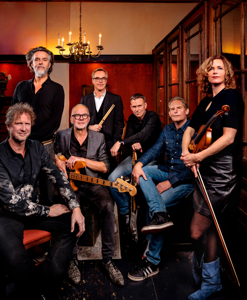 Van links naar rechts: Erik (zang & gitaar), Robin (gitaar & zang), Ad (bas & gitaar), Erwin (drums), Ingmar (toetsen & gitaar), Martijn (gitaar, zang & bas) en Klaartje (viool, zang & percussie).